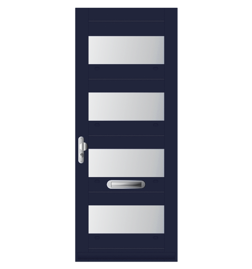 Voordeur. Massief hardhout in FSCĀ® of NON-FSCĀ®. Leveringen onder KOMO keurmerk, PKVW keurmerk en 6 jaar garantie. De deuren kunnen optioneel voorzien worden van een weldorpel. Afwerking: voor- of aflak in een RAL kleur.