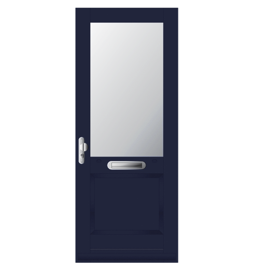 Voordeur. Massief hardhout met 1-zijdig bossingpaneel in FSC® of NON-FSC®. Leveringen onder KOMO keurmerk, PKVW keurmerk en 6 jaar garantie. De deuren kunnen optioneel voorzien worden van een 2-zijdig bossingpaneel en een weldorpel. Afwerking: voor- of aflak in een RAL kleur.