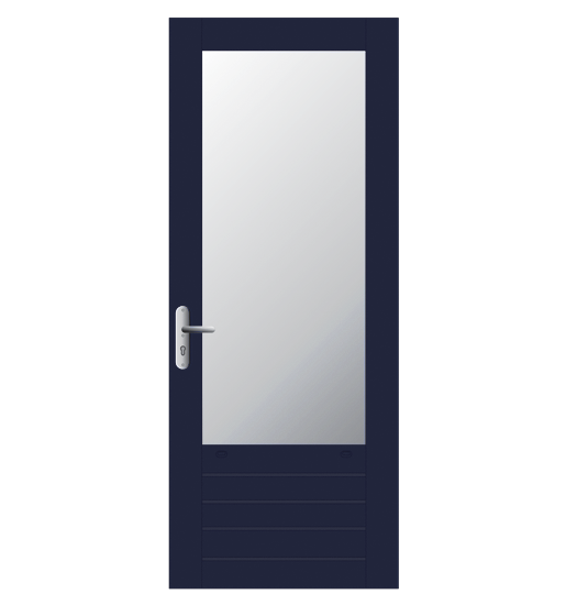 Achterdeur. Massief hardhout in FSC® of NON-FSC®. Leveringen onder KOMO keurmerk, PKVW keurmerk en 6 jaar garantie. Afwerking: voor- of aflak in een RAL kleur.